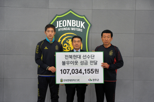 이번 성금은 K-리그 클래식 우승까지 선수들에게 응원을 보내준 팬들을 위한 보답이다. '캡틴' 이동국과 '최고참' 김남일을 비롯한 전북 선수단과 코칭스태프가 자발적으로 1억원의 성금을 모았다. 여기에 지난 3월 심판 판정에 대한 불만 제기로 제재금 700만원을 받았던 최강희 전북 감독을 위해 팬들이 모금한 703만4155원이 함께 더해졌다. 최 감독은 "팬들이 사랑으로 모금해준 소중한 금액이다. 모든 분의 애정과 깊은 듯이 담겨 있는 만큼 좋은 일에 사용되길 바란다"고 말했다. 이동국은 "팬이 있어야 우리가 존재한다. 좋은 환경에서 많은 팬들과 함께 이룬 우승인 만큼 뜻깊게 연말을 보내자는 선수들의 의견으로 이번 기부행사에 나서게 됐다. 따뜻한 연말연시가 되었으면 좋겠다"며 성금 모금 배경을 설명했다. 1억여원의 성금은 지난달 27일 전북 완주의 클럽하우스를 방문한 박성일 완주군수에게 전달됐다. 이밖에 전북 선수단은 구단의 사회공헌사업 정책에 따라 자신의 연봉 1%를 도서벽지 학생초청에 사용하고 있다.