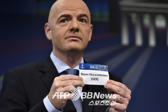 지아니 인판티노 UEFA 사무총장이 UCL 16강 조추첨에서 레버쿠젠을 뽑고 있다. ⓒAFPBBNews = News1