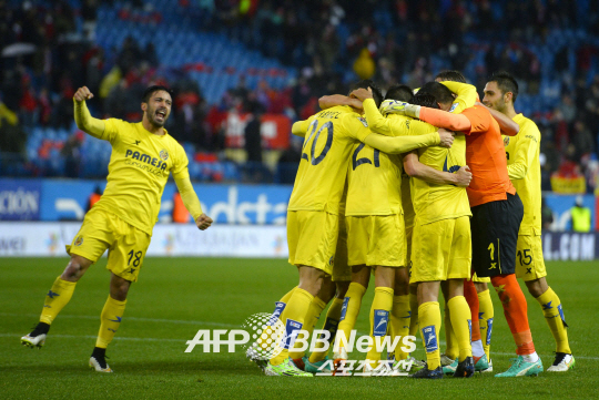 ◇아틀레티코 마드라드를 무너뜨린 비야레알 선수들이 기뻐하고 있다. 마드리드(스페인)=ⓒAFPBBNews = News1