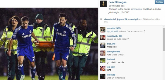 파브레가스는 자신의 SNS에 들것을 들어옮기는 사진을 띄웠다. "오늘밤 8강전에서 아스필리쿠에타와 나는 투잡을 뛰었다"는 글과 함께 였다. 팬들은 파브레가스의 아름다운 동료애에 '리스펙트(respect!)'등의 댓글을 달며 칭찬 릴레이를 이어가고 있다.