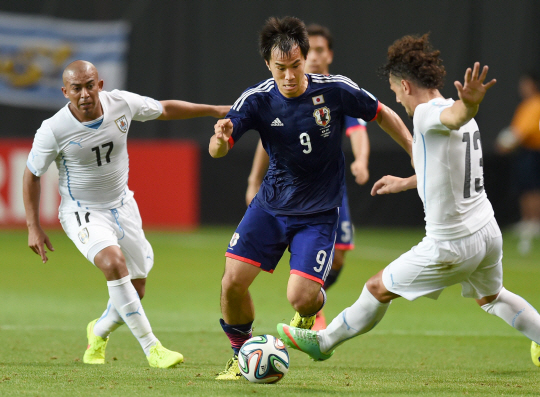 ◇일본 대표팀 공격수 오카자키 신지(가운데)가 지난 9월 5일 홋카이도의 삿포로돔에서 열린 우루과이와의 평가전에서 드리블 하고 있다. ⓒAFPBBNews = News1