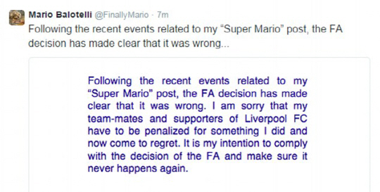 결국 발로텔리는 4일 트위터를 통해 공식사과했다. '내 글로 인해 상처를 받은 모든 분들께 사과드린다. 그 글은 인종차별에 반대하는유머였다. 이제서야 그 글의 맥락이 반대로 읽힐 수도 있다는 것을 이해하게 됐다. 모든 멕시코인들이 콧수염이 있는 것이 아니고, 모든 흑인들이 높이 점프할 수 있는 것이 아니며, 모든 유대인들이 돈을 사랑하는 것은 아니기 때문이다. 다른 사람이 그린 카툰을 이용한 것은 그것이 슈퍼마리오였고, 나는 그것이 재밌다고만 생각했지, 불쾌할 것이라고는 생각하지 못했다. 다시 한번 미안하다'고 썼다.