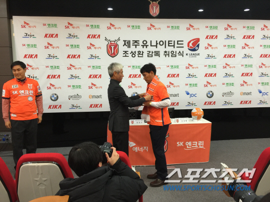 19일 제주 서귀포시 클럽하우스 인재관 강당에서 열린 조성환 제주 신임 감독의 취임식에 특별한 손님이 함께 했다. 박경훈 전 제주 감독이었다. 박 감독은 시즌 종료 후 자진 사퇴를 선언했다. 계약기간이 1년 남았지만 상호 합의 하에 아름다운 이별을 선언했다. 박 감독의 아름다운 이별은 조 감독의 취임식에서도 이어졌다.
