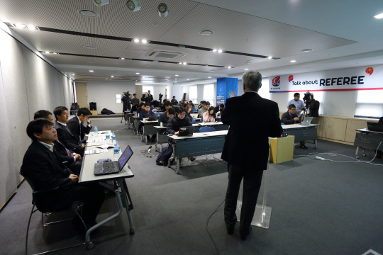 프로축구연맹은 19일 서울 신문로 축구회관에서 심판 운영 설명회인 '토크 어바웃 레프리2'를 개최했다. 이날 이운택 심판위원장은 전임심판 운영 시스템 K리그 심판위원회 소개 심판 배정 및 관리, 평가 시스템 심판 교육 및 지원 제도 2014시즌 심판 판정 현황 및 분석 결과를 공유했다. 또 김종혁 고형진 이정민 심판도 참석, 질의 응답 시간도 가졌다.
