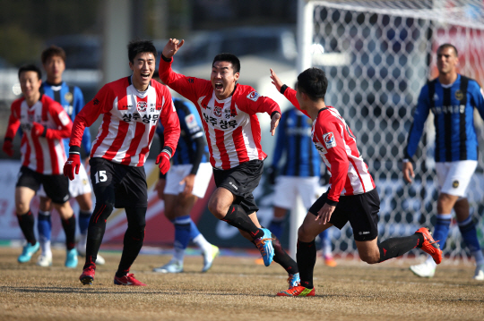 2014년 K-리그 클래식 인천전에서 득점에 성공한 뒤 기뻐하고 있는 이정협(가운데). 사진제공=프로축구연맹
