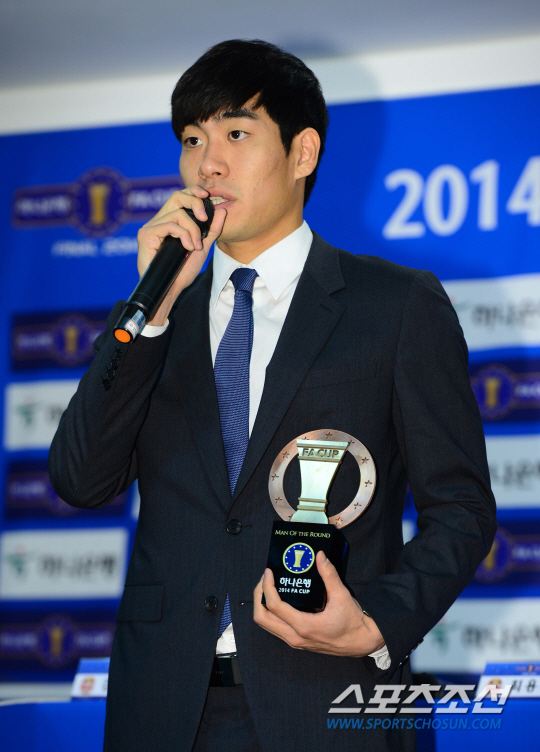 20일 오전 서울 신문로 축구회관에서 2014 FA컵 결승 미디어데이가 열렸다. 미디어데이에서 6라운드 MOR(Man of the Round)로 뽑힌 FC서울 김주영이 수상 소감을 밝히고 있다. 김경민 기자 kyungmin@sportschosun.com / 2014.11.20.