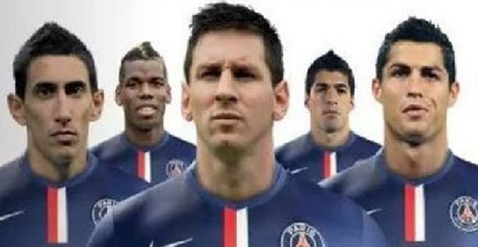 | PSG 유니폼이 입혀진 디 마리아, 포그바, 메시, 수아레스, 호날두(왼쪽부터). |