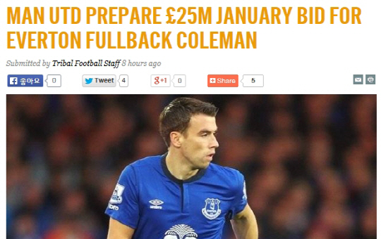 30일(한국시각) 영국 일간지 데일리스타는 맨유가 에버턴의 풀백 시무스 콜먼 영입전에 뛰어들었다고 보도했다. 데일리스타는 맨유가 콜먼을 영입하기 위해 2500만파운드를 제시할 예정이라고 보도했다. 콜먼은 과감한 오버래핑과 정교한 크로스로 에버턴의 오른쪽 측면 공격을 이끌고 있다. 스리백을 구사하는 루이스 판 할 감독이 원하는 스타일의 풀백이다. 맨유는 지난 여름이적시장에서도 콜먼의 영입을 노렸지만 실패한 바 있다. 맨유는 겨울이적시장에서 과감한 투자로 콜먼의 마음을 사로잡겠다는 각오다. 콜먼 영입전에는 맨유 뿐만 아니라 첼시도 뛰어든 상태다.