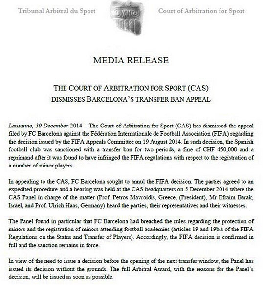 스페인 라디오 온다세로의 알프레도 마르티네스 기자는 30일(한국 시각) "CAS가 바르셀로나의 항소를 기각했다"라며 CAS 측 보도자료 전문을 공개했다. CAS는 "지난 8월 FIFA의 징계에 대한 바르셀로나의 항소를 기각한다"라고 밝혔다.