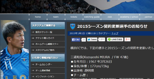 지난달 미우라와 재계약에 합의한 요코하마는 미우라의 등번호 11번에 맞춰 1월 1일 오후 1시 11분에 공식 홈페이지를 통해 계약 연장 사실을 공개해 눈길을 끌었다.
