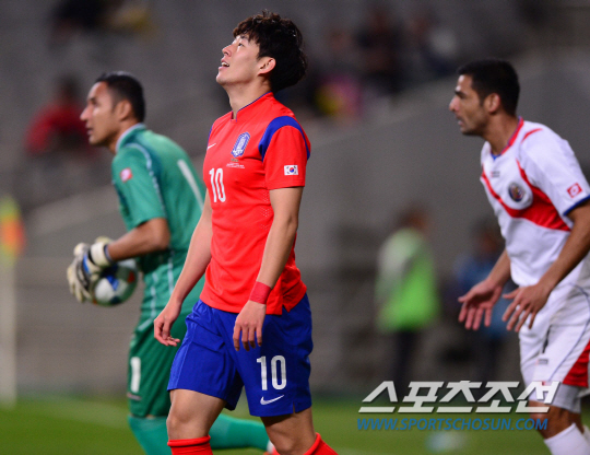 14일 오후 서울 상암월드컵구장에서 한국 축구국가대표팀과 코스타리카의 평가전이 열렸다. 전반 볼을 놓친 손흥민이 아쉬워하고 있다. 상암=김경민 기자 kyungmin@sportschosun.com / 2014.10.14.