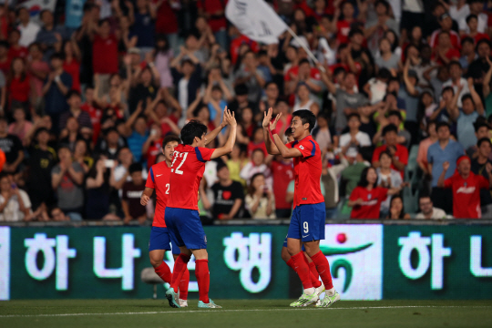 퍼택스타디움 / AFC 2014 호주 아시안컵/ 친선경기/ 사우디전/ 대표팀 훈련/ 이정협 득점/ 골 세레머니/ 김창수 /사진 이연수