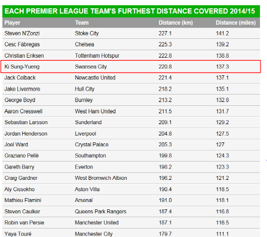 1위는 스토크시티의 스티븐 은존지(227.1㎞)였다. 올시즌 가장 많이 뛰는 팀 중 하나인 스토크시티에서도 가장 많이 뛴 선수였다. 2위는 14도움을 기록중인 '아스널 출신 첼시 에이스' 세스크 파브레가스로 225.3㎞를 커버했다. 토트넘의 창의적인 플레이메이커, 크리스티안 에릭슨은 222.8㎞를 뛰며 3위에 올랐다.