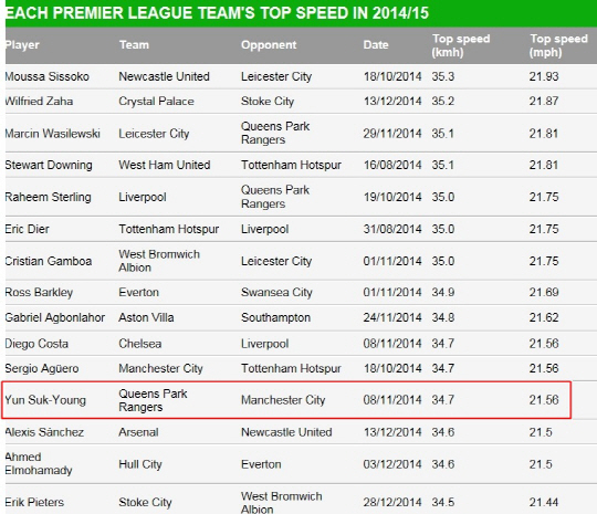 이날 발표된 순위에선 뉴캐슬 미드필더 무사 시소코가 올시즌 가장 빠른 선수 1위에 올랐다. 10월 레스터시티전에서 시속 35.3㎞의 어마어마한 스피드를 찍었다. 윌프리드 자하(크리스털팰리스,시속 35.2㎞)가 2위,레스터시티 수비수 마르신 바실레프스키와 웨스트햄 스튜어트 다우닝(이상 시속 35.1㎞)이 나란히 3위에 올랐다. 스털링(리버풀)은 시속 35㎞로 에릭 디에(토트넘), 크리스티안 감보아(웨스트브롬위치)와 나란히 5위다. 에버턴의 로스 바클리(시속 34.9㎞)가 8위, 애스턴빌라의 가브리엘 아흐본라허(시속 34.8㎞)가 9위를 기록했다. 윤석영은 지난해 11월8일 맨시티전에서 기록한 시속 34.7㎞로 첼시의 디에구 코스타, 맨시티의 세르히오 아구에로와 나란히 공동 10위에 올랐다. '치고 달리기'로 둘째 가라면 서러운 11위 알렉시스 산체스(아스널)의 34.6㎞보다 빨랐다. 리그 최강, 세계 최고의 공격수들에게도 결코 밀리지 않는 '빠른 발'을 입증했다.