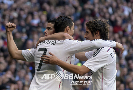 | 골을 넣은 하메스 에르난데스가 크리스티아누 호날두 등과 포옹하며 기뻐하고 있다. ⓒAFPBBNews = News1 |