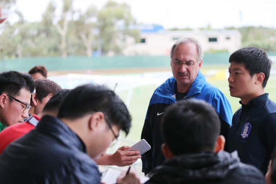 ◇울리 슈틸리케 A대표팀 감독이 11일(한국시각) 호주 캔버라의 매켈러 파크에서 한국 취재진과 간담회를 갖고 있다. 사진제공=대한축구협회