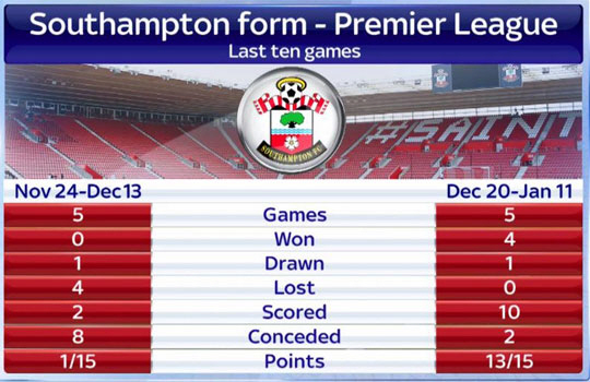 사우샘프턴은 리그 초반 첼시에 이어 2위를 질주하며 상승세를 탔지만, 11월 30일 맨체스터시티 전 0-3 참패를 시작으로 '죽음의 일정'에 허덕였다. 아스널-맨유 등 상위권 팀에 잇따라 패하며 '반짝 상승세'라는 비아냥거림을 받았다. 하위권팀 번리, 3부리그 쉐필드 유나이티드(리그컵)에게까지 무너지며 급속도로 추락했다.