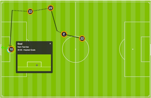 오른쪽 코너를 매섭게 파고든 차두리가 절묘한 크로스를 올렸고, 이를 남태희가 상대 골문 앞에서 머리로 정확히 받아넣었다. 상대 골키퍼가 손을 쓸 수 없는 선제골이었다.