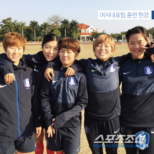 중국에 기적같은 3대2 역전승을 거둔 후, 멕시코전을 준비하는 여자축구대표팀의 분위기는 더없이 밝아보였다. 왼쪽부터 유영아 심서연 지소연 전가을 송수란. 사진제공=대한축구협회