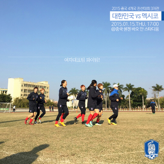 윤덕여 감독이 이끄는 여자축구대표팀은 15일 오후 5시(한국시각) 중국 쉔젠 바오안스포츠센터에서 펼쳐지는 중국4개국 친선대회 3차전에서 멕시코와 격돌한다. 1차전에서 월드컵 주최국 캐나다에 1대2로 역전패했다. 전반34분, 지소연의 킬패스를 이어받은 여민지가 선제골을 터뜨렸지만, 후반 캐나다에 2골을 허용하며 아쉽게 패했다. 2차전에서 홈팀 중국에 3대2로 역전승했다. 전반 2골을 내줬지만 1분만에 지소연의 도움을 받은 유영아의 만회골이 터졌고, 후반 유영아가 유도해낸 PK를 지소연이 성공시켜 승부를 원점으로 돌렸으며, '테크니션' 전가을의 아름다운 중거리포로 짜릿한 3대2 역전 드라마를 썼다. 유영아 전가을 지소연 여민지 등 공격라인이 고르게 득점했고, '지메시' 지소연은 1골2도움으로 이름값을 톡톡히 했다.