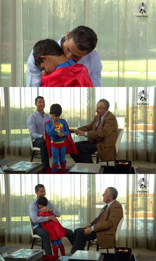 크리스티아누 주니어는 머리부터 발끝까지 슈퍼맨 의상으로 차려입은 채 등장했다. 호날두는 품안에 쏙 안겨드는 아들을 뿌듯하게 안아준 뒤, 잘 달래 돌려보냈다. 크리스티아누 주니어가 막 잠에서 깨어난 듯한 모습임을 감안하면, 슈퍼맨 의상은 그의 잠옷일 가능성도 있어보인다.