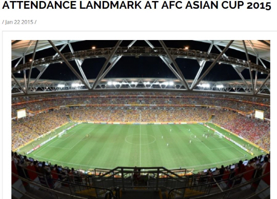 2015년 호주아시안컵 관중수가 이미 4년전인 2011년 카타르대회를 넘어섰다. 아시아축구연맹(AFC)은 22일(한국시각) 홈페이지를 통해 '8강 2경기(한국vs우즈베키스탄, 호주vs중국)까지 치른 현재 총 관중수가 46만5381명을 기록했다. 이는 카타르대회의 총 관중수인 42만1000명을 넘어선 것'이라고 발표했다.
