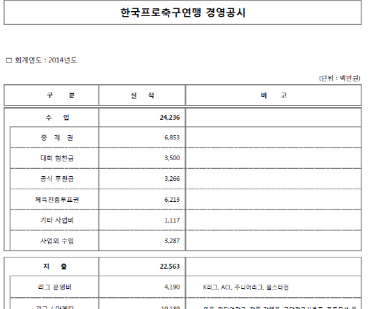 프로축구연맹이 2014년도 연맹의 수입과 지출 항목이 담긴 결산서를 K리그 홈페이지(www.kleague.com)를 통해 공시한다.