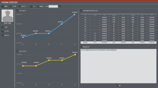 포항 구단 측은 "올해는 경기별(대회, 시즌별) 평가 점수, 부상 내역, 팀 전체 및 선수 개인별 연봉과 수당 추이 등 체계적으로 관리할 수 있는 솔루션을 적용할 예정"이라고 밝혔다.