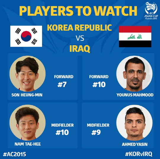 아시아축구연맹(AFC)이 손흥민(23·레버쿠젠)과 남태희(24·레퀴야)를 2015 아시안컵 이라크와의 4강전에서 눈여겨 봐야 할 선수로 꼽았다.