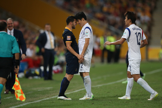 | 한국의 김창수가 17일 브리즈번스타디움에서 열린 호주와의 아시안컵 3차전에서 호주의 비치히와 머리를 맞대고 신경전을 펼치고 있다. 사진제공=대한축구협회 |