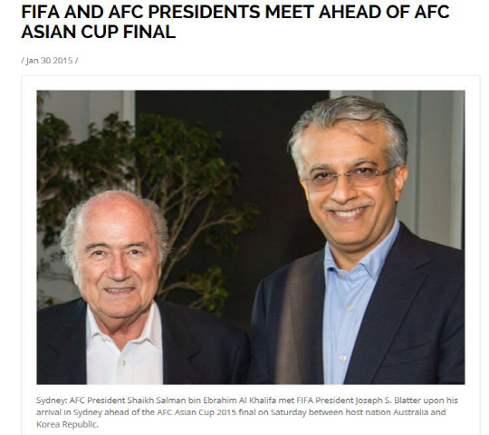 한편 이날 호주 시드니에서는 국제축구연맹(FIFA) 회장 5선에 도전한 제프 블래터 회장이 셰이크 살만 회장을 만나 덕담을 주고 받는 등 본격적인 선거운동에 돌입했다.