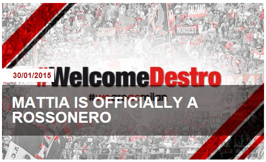 AC밀란은 31일(한국시각) 구단 공식 홈페이지를 통해 AS로마 공격수 마티아 데스트로 임대 영입을 발표했다. 데스트로의 임대 기간은 6개월이고, 완전 영입 옵션이 포함된 것으로 알려졌다. 이탈리아 언론은 임대료 70만 유로에 완전 영입시 이적료가 1600만 유로라고 추정하고 있다. 데스트로는 지난시즌 13골을 기록하며 신데렐라로 떠올랐다. 잉글랜드 프리미어리그팀들의 러브콜을 받았다. 올시즌에도 5골을 성공시킨 데스트로는 AC밀란의 빈약한 공격력을 끌어올릴 구세주로 지목됐다.