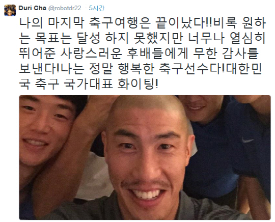 차두리는 지난 14년간 멈추지 않았다. 지난 2001년 11월 8일 세네갈과의 평가전에서 데뷔한 이후 2015년 1월 31일 호주아시안컵 결승전까지 75차례 A매치에 출전해 4골을 기록했다. 2002년 한일월드컵 4강 신화, 2010년 남아공월드컵 첫 원정 16강의 위업을 달성했다. 황선홍, 최용수, 김도훈 등 걸출한 60~70년대생 선배들 박주영, 이근호 등 80년대 후배들, 손흥민, 기성용, 김진수 등 90년대생 후배들이 모두 그의 동료다.