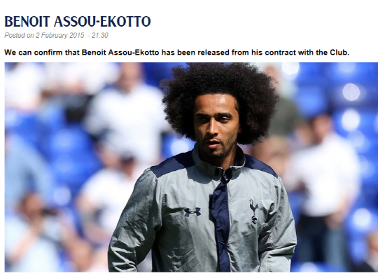 지난시즌 QPR에서 윤석영과 포지션 경쟁을 펼쳤던 베누아 아수 에코토가 결국 토트넘에서 방출됐다.