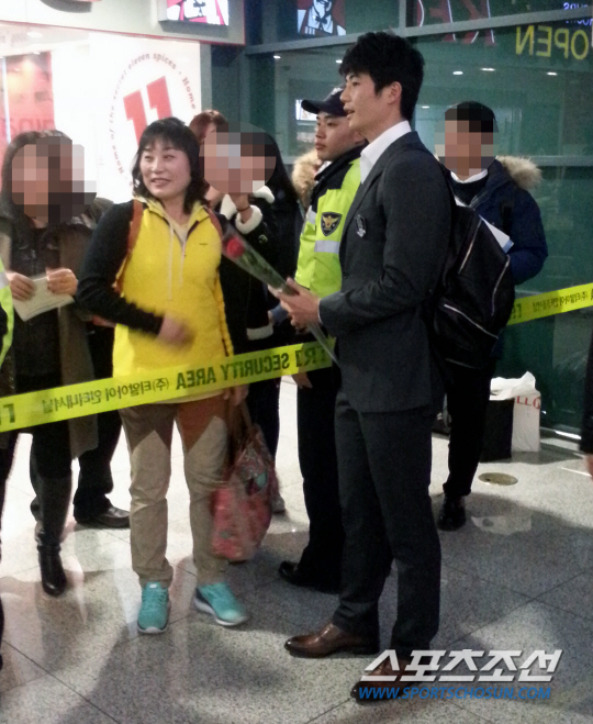 팬들에게 받은 꽃 한송이를 들고 어머니 남영숙씨와 대화를 나누고 있는 기성용. 인천공항=하성룡 기자