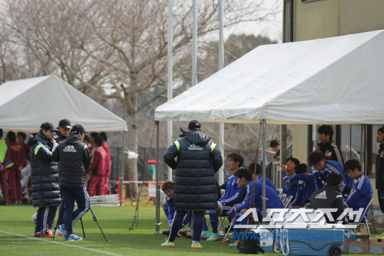 ◇윤정환 울산 감독(왼쪽 세번째)이 2일 일본 미야자키현 사이토시 운동장에서 열린 후쿠오카대학과의 연습경기에 앞서 선수들에게 작전을 지시하고 있다. 울산은 A, B팀으로 나눠 치른 후쿠오카대학전에서 각각 4대0(A팀), 3대0(B팀)으로 압승했다. 태국 치앙마이 전지훈련 뒤 일시 귀국했던 울산 선수단은 지난달 30일 미야자키에 도착, 2차 전지훈련에 돌입했다. 울산 선수단은 9일까지 연습경기 등 실전 감각을 끌어올리는 데 주력하며 새 시즌 담금질을 할 계획이다. 사이토(일본)=박상경 기자 ppark@sportschosun.com