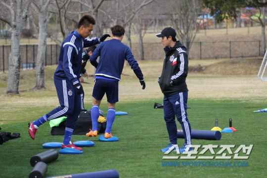◇울산 공격수 김신욱(왼쪽)이 2일 일본 미야자키현 사이토시 운동장에서 열린 후쿠오카대학과의 연습경기에 앞서 몸을 풀자 윤정환 울산 감독이 다가가 대화를 나누고 있다. 태국 치앙마이 전지훈련 뒤 일시 귀국했던 울산 선수단은 지난달 30일 미야자키에 도착, 2차 전지훈련에 돌입했다. 울산 선수단은 9일까지 연습경기 등 실전 감각을 끌어올리는 데 주력하며 새 시즌 담금질을 할 계획이다. 사이토(일본)=박상경 기자 ppark@sportschosun.com
