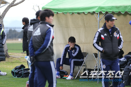 ◇울산 공격수 양동현(가운데)이 2일 일본 미야자키현 사이토시 운동장에서 열린 후쿠오카대학과의 연습경기에 앞서 그라운드를 바라보고 있다.