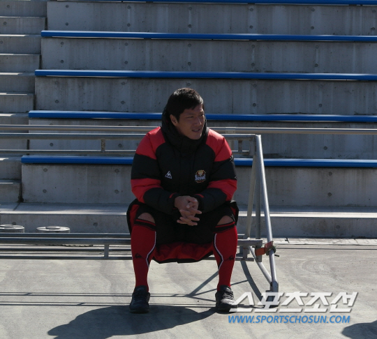◇FC서울 수비수 김진규가 3일 일본 가고시마현 가고시마시에서 가진 J2 이와타와의 연습경기를 앞두고 벤치에 앉아 그라운드를 지켜보고 있다.