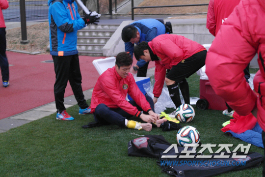 ◇대전 수비수 윤원일이 4일 일본 가고시마현 가고시마시의 후레아이스포츠랜드 연습구장에서 팀 훈련을 마친 뒤 몸을 추스르고 있다.
