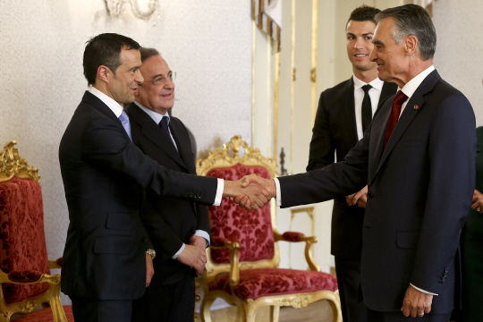 포르투갈 대통령 아니발 카바코 실바(오른쪽)와 악수를 하고 있는 크리스티아누 호날두의 슈퍼 에이전트 조지 멘데스. ⓒAFPBBNews = News1
