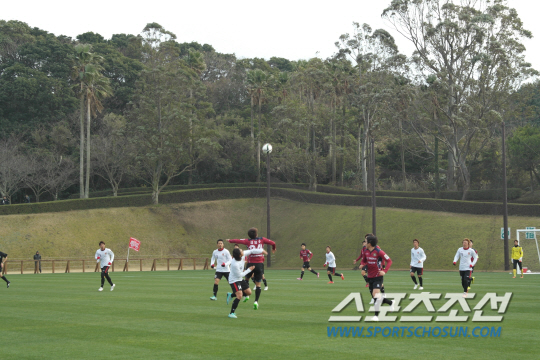 ◇대전 수비수 윤신영(가운데)이 5일 일본 가고시마현 이부스키의 이와사키 연습구장서 가진 우라와전에서 공중볼 경합을 벌이고 있다. 대전은 이날 경기서 J리그 최강 우라와를 상대로 가진 1군 간의 첫 경기서 전반 25분 결승골을 내주며 0대1로 졌다. 그러나 대등한 경기력 속에 수 차례 찬스를 만들어내면서 내년 시즌 희망을 품게 했다. 가고시마에서 2차 동계 전지훈련을 진행 중인 대전은 오는 18일 귀국할 계획이다. 이부스키(일본)=박상경 기자 ppark@sportschosun.com
