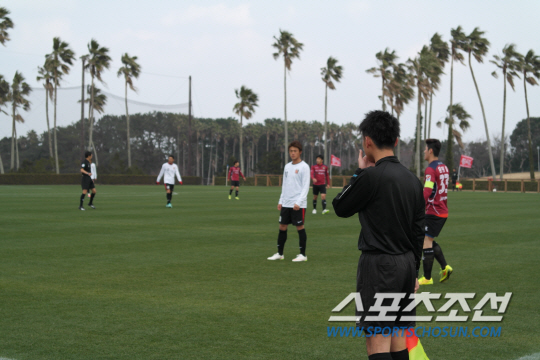 ◇우라와 공격수 이충성(가운데)이 5일 일본 가고시마현 이부스키의 이와사키 연습구장서 가진 대전과의 연습경기에서 동료의 플레이를 지켜보고 있다. 대전은 이날 경기서 J리그 최강 우라와를 상대로 가진 1군 간의 첫 경기서 전반 25분 결승골을 내주며 0대1로 졌다. 그러나 대등한 경기력 속에 수 차례 찬스를 만들어내면서 내년 시즌 희망을 품게 했다. 가고시마에서 2차 동계 전지훈련을 진행 중인 대전은 오는 18일 귀국할 계획이다. 이부스키(일본)=박상경 기자 ppark@sportschosun.com