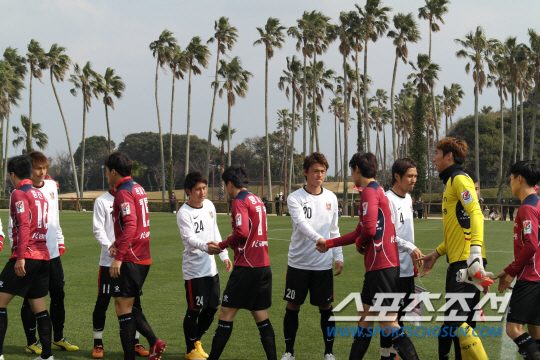 ◇우라와 공격수 이충성(가운데)이 5일 일본 가고시마현 이부스키의 이와사키 연습구장서 가진 대전과의 연습경기에 앞서 대전 선수들과 인사를 나누고 있다. 대전은 이날 경기서 J리그 최강 우라와를 상대로 가진 1군 간의 첫 경기서 전반 25분 결승골을 내주며 0대1로 졌다. 그러나 대등한 경기력 속에 수 차례 찬스를 만들어내면서 내년 시즌 희망을 품게 했다. 가고시마에서 2차 동계 전지훈련을 진행 중인 대전은 오는 18일 귀국할 계획이다. 이부스키(일본)=박상경 기자 ppark@sportschosun.com