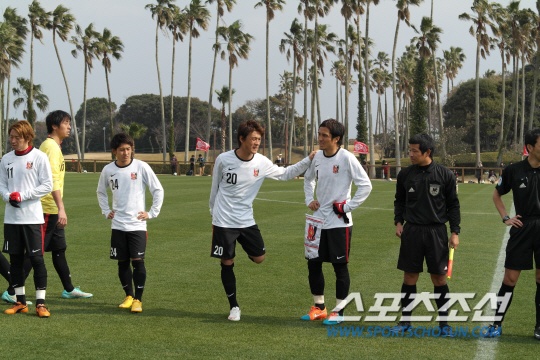 우라와 공격수 이충성(왼쪽 네번째)이 5일 일본 가고시마현 이부스키의 이와사키 연습구장서 가진 대전과의 연습경기 출전에 앞서 동료와 이야기를 나누고 있다. 대전은 이날 경기서 J리그 최강 우라와를 상대로 가진 1군 간의 첫 경기서 전반 25분 결승골을 내주며 0대1로 졌다. 그러나 대등한 경기력 속에 수 차례 찬스를 만들어내면서 내년 시즌 희망을 품게 했다. 가고시마에서 2차 동계 전지훈련을 진행 중인 대전은 오는 18일 귀국할 계획이다. 이부스키(일본)=박상경 기자 ppark@sportschosun.com