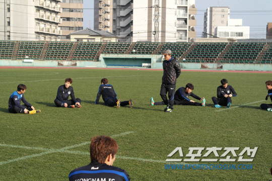 ◇김학범 성남 감독(가운데)이 6일 일본 구마모토현 구마모토시의 스이젠지 경기장에서 열린 팀 훈련에서 선수들의 스트레칭을 지도하고 있다.