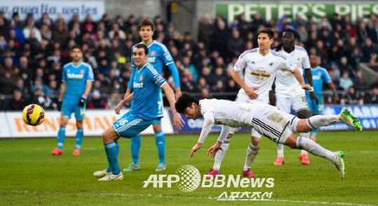 | 기성용의 동점 헤딩골 순간. ⓒAFPBBNews = News1 |