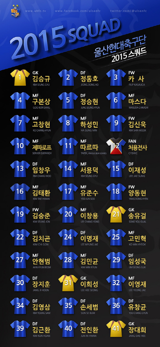 한편, 울산 구단은 오는 16일부터 홈페이지(http://www.uhfc.tv)를 통해 2015시즌 유니폼을 판매할 계획이다.