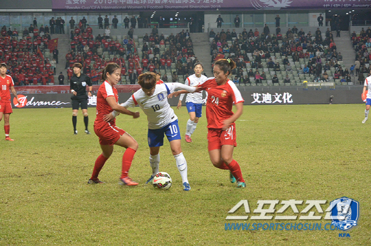 | 지소연이 중국 수비수 2명의 밀착마크를 뚫어내며 드리블하고 있다. 사진제공=대한축구협회 |