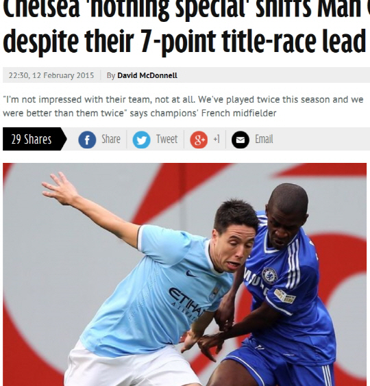 첼시와 우승경쟁을 펼치고 있는 맨시티의 미드필더 사미르 나스리의 말이다. 맨시티(승점 52)는 첼시(승점 59)에 승점 7점 뒤진 2위를 달리고 있다. 나스리는 13일(한국시각) 영국 일간지 데일리미러와의 인터뷰에서 첼시의 경기력이 인상적이지 않다며 역전의 기회가 찾아올 것이라고 했다. 나스리는 "나는 조제 무리뉴의 엄청난 팬이다. 하지만 첼시는 전혀 인상적이지 않다"며 "첼시와 맨?箸섦 두번 맞붙었다. 한번은 10명이서 싸웠고, 한번은 원정이었다. 두번 다 1대1로 비겼지만 우리가 더 나은 팀이었다. 첼시는 단지 피지컬적으로 뛰어나고 최전방이 강할 뿐이다. 나에게 첼시는 전혀 특별하지 않다"고 했다.